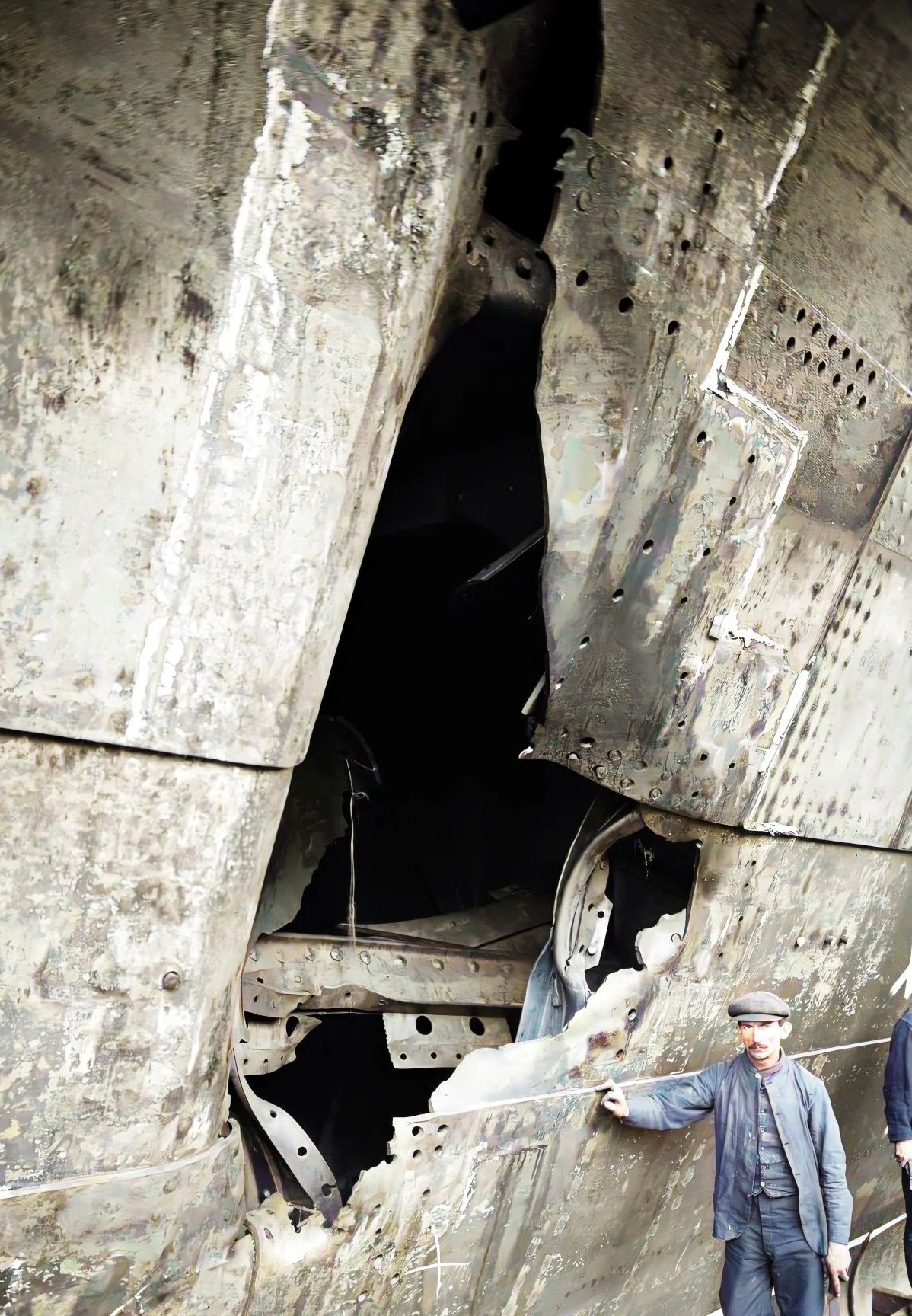 The damage to the hull of Olympic after her collision with HMS Hawke