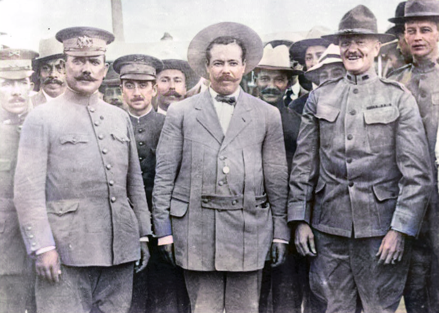 Pershing with Mexican Revolutionary leaders Alvaro Obregon and Pancho Villa. Note Pershing’s adjutant, George S. Patton, on the far right
