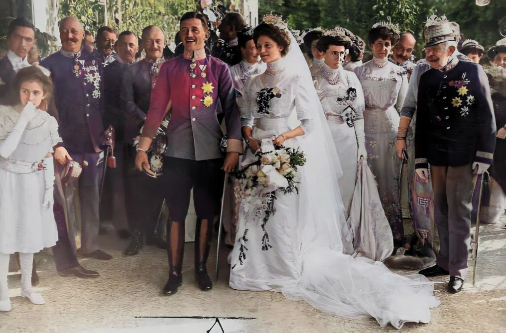 Karl and his wife, Zita, on their wedding day. Kaiser Franz-Josef is standing to the right