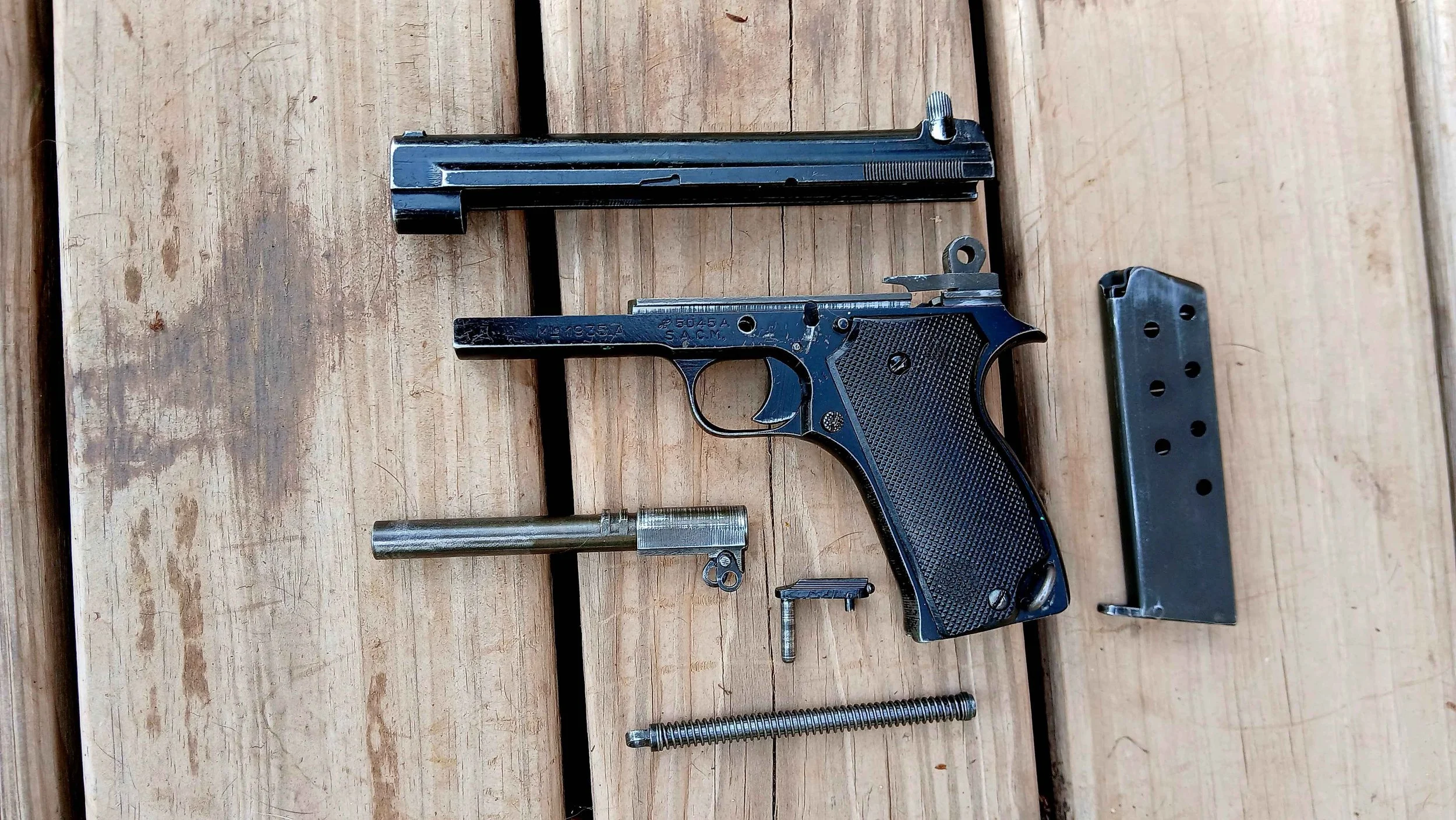 The pistol disassembled, note the captive recoil spring and dual barrel links