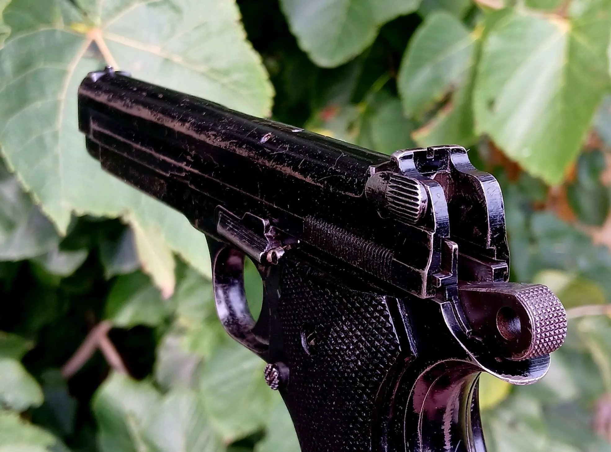 Externally, the 35A is a graceful looking design, with gently curved lines and minimal protrusions. These were finished by the French via bluing before a thick layer of black enamel was applied for a corrosion resistant finish, although the coating often shows scratches and chips decades down the line. The controls are simple, with a large slide release on the side of the frame and a safety lever on teh slide near the rear sight. This is rotated 90 degrees upward to engage, and rotates a steel block to prevent the hammer from contacting the firing pin. It should be noted that the trigger assembly works as normal with the safety engaged, and will allow the hammer to drop. The pistol also features a magazine safety, and a loaded chamber indicator atop the slide that works in a similar manner as that on the German Luger, with the rim of a cartridge tipping it upwards at the front to show its loaded condition.