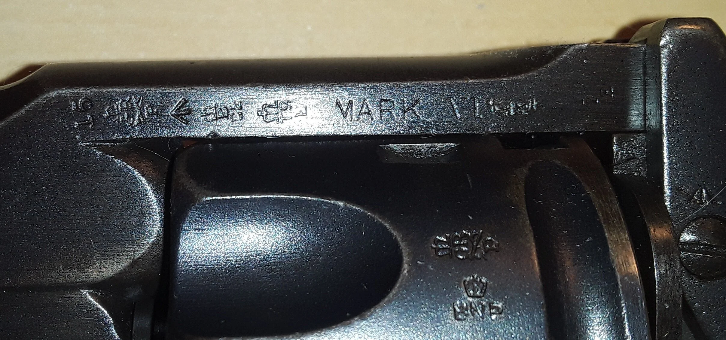 The MkVI, like its predecessors, chambered the .455 Webley cartridge, which, although now using a smokeless propellant, had originally been a black powder design when the MkI was adopted in 1887. The .455 had seen a number of changes over the years, including a controversial hollow point wadcutter bullet in the MKIII that was withdrawn due to violating the Hague Conventions. The standard service cartridge when the great war broke out was the older roundnose lead MKII, the wadcutter experiment having been abandoned after the MKV in 1914. The MKII would serve throughout the First World War and beyond, replaced on the eve of the Second World War with the full metal jacket MKVI cartridge even as the .455 was being phased out in favor of the .38/200 in British service.