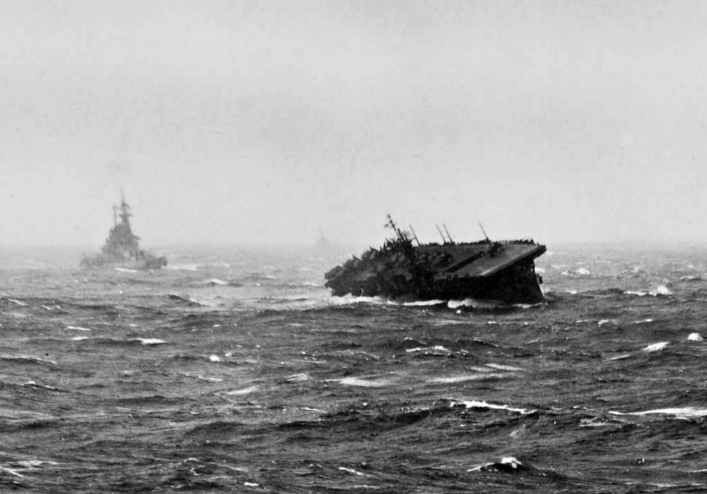 An escort carrier rolling during Halsey’s Typhoon