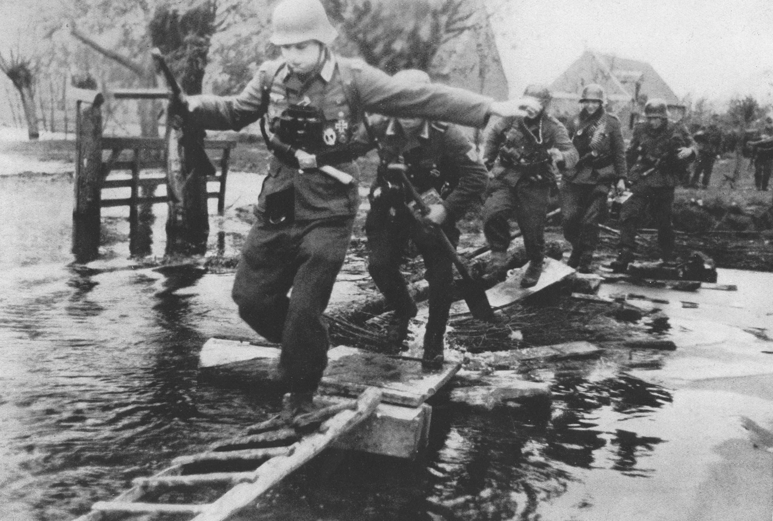 German soldiers cross a makeshift bridge during the fighting for the Scheldt