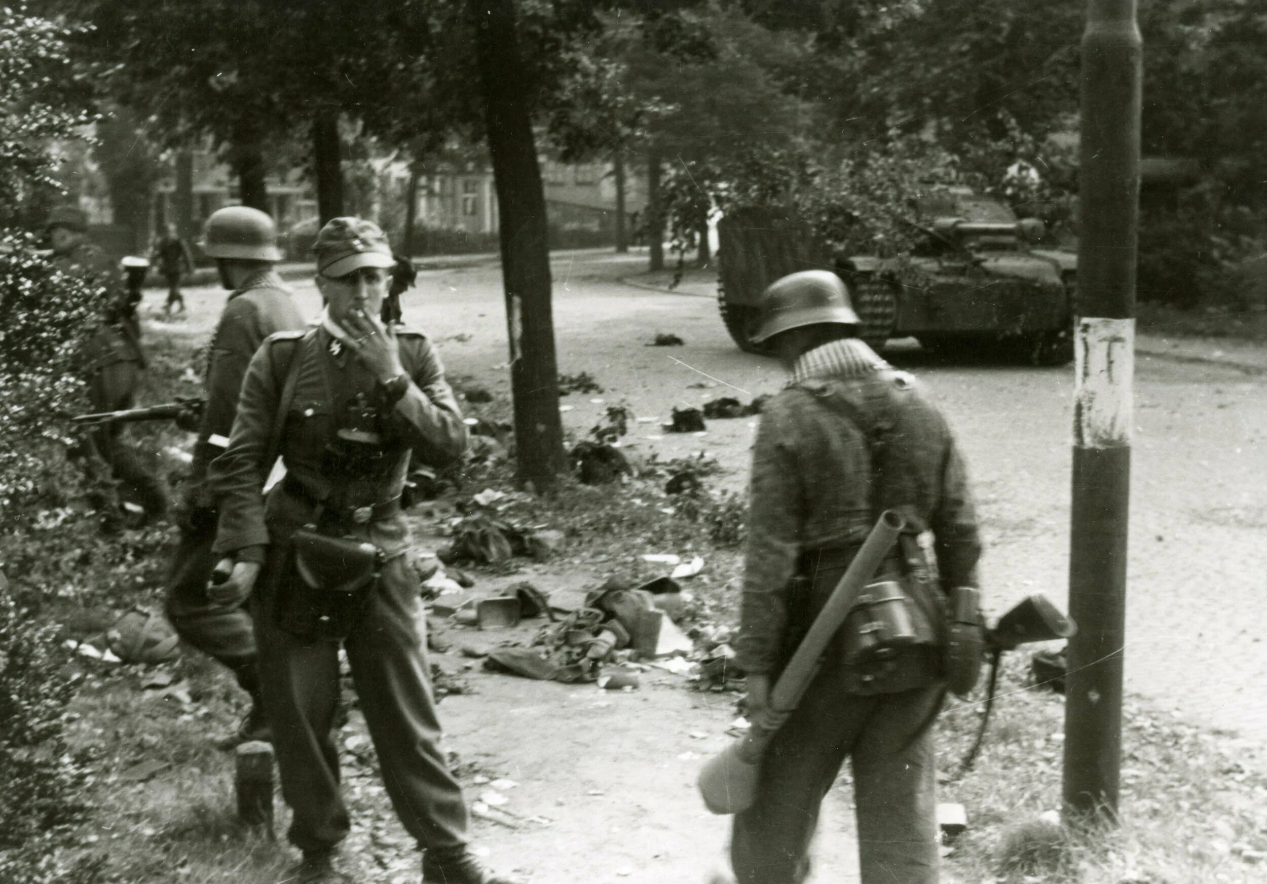 Waffen SS men on the streets of Arnhem, with a STUG passing in the background