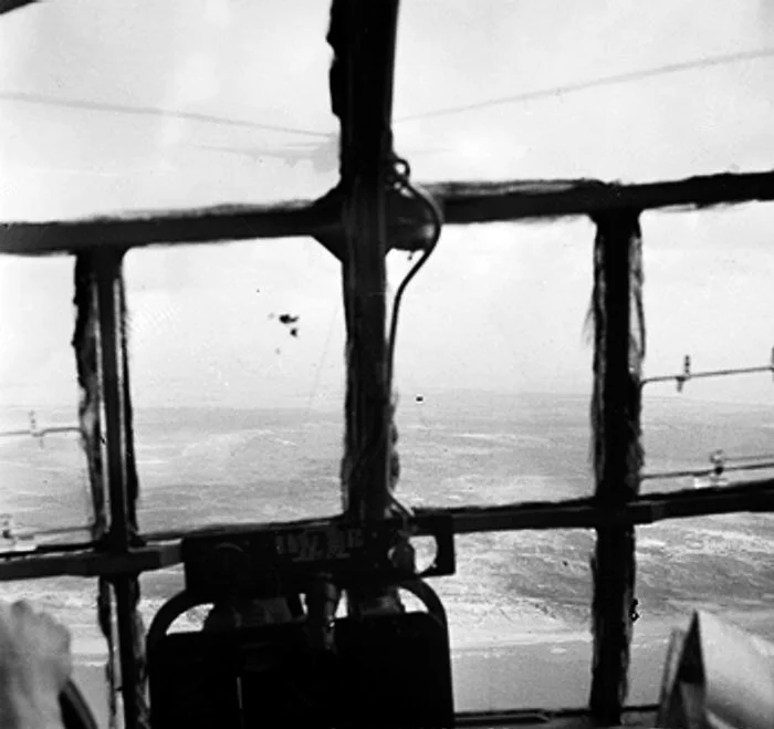 British Horsa gliders after landing in Holland, as additional paratroopers land around them