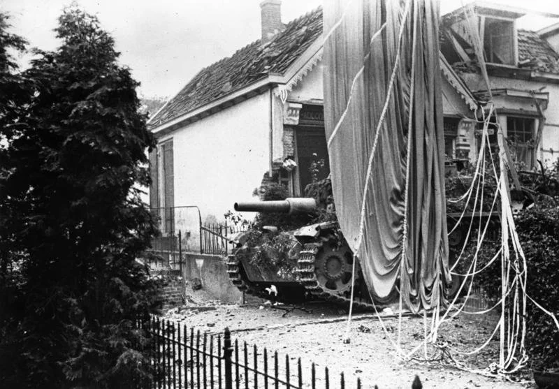 A German self-propelled gun passes an abandoned parachute near Arnhem