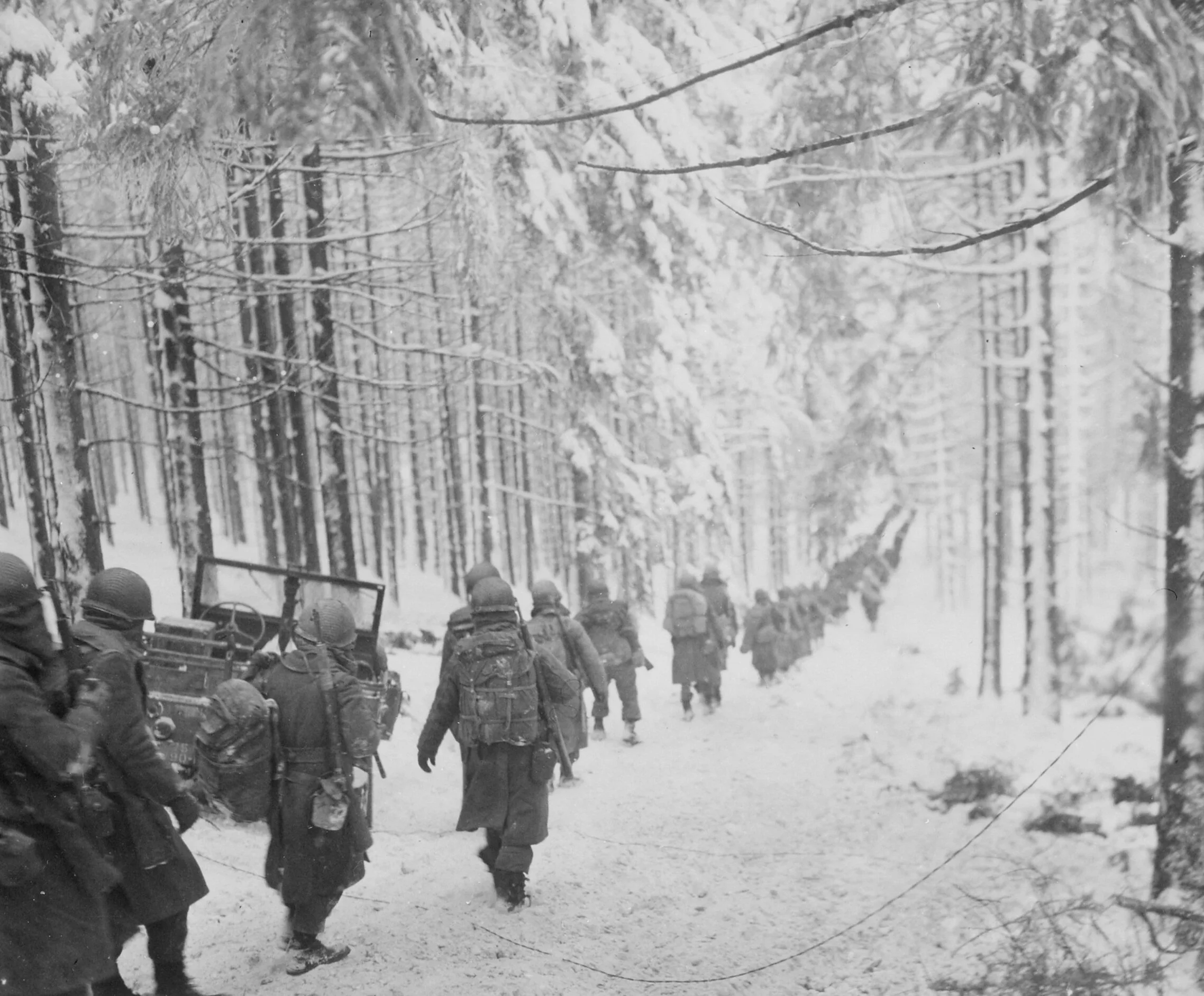 American troops move through the snow covered forest toward St. Vith