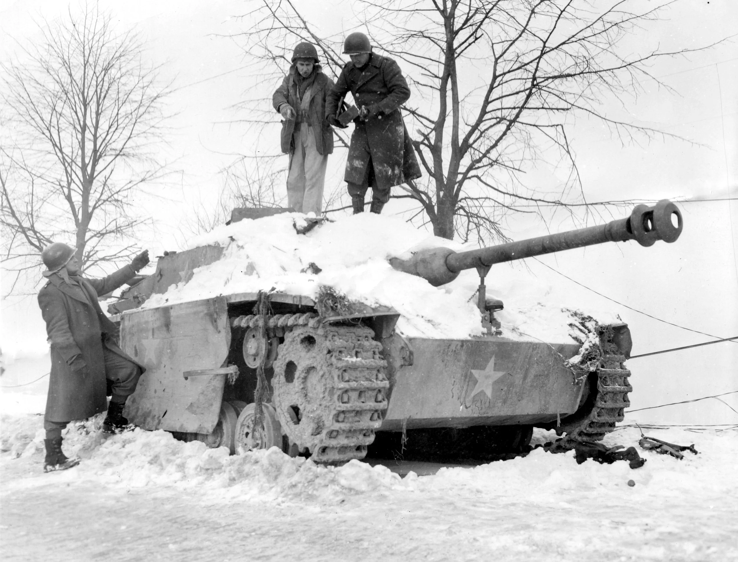 American soldiers inspect a knocked out STUG assault gun, bearing a US star