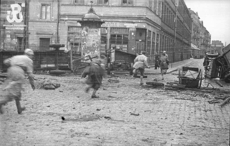 Polish soldiers fight amongst the rubble of Warsaw, one armed with a homemade Blyskawica submachine gun