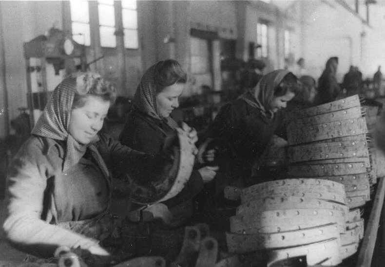 Soviet forced laborers in a German factory, brought in to replace the men sent to the front lines